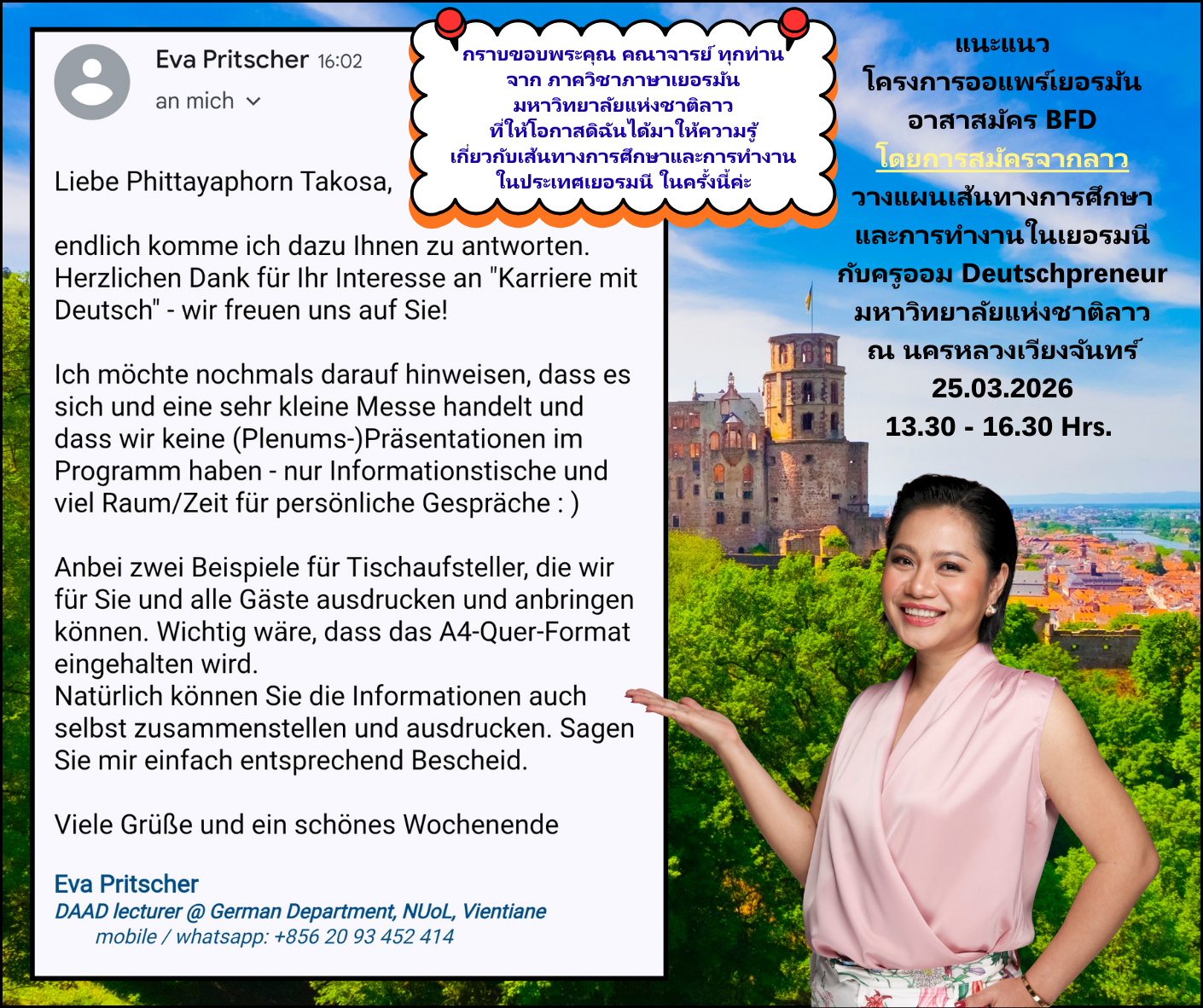 นอกจากนี้ครูออมยังสนับสนุนการเตรียมความพร้อมในทุกด้านให้กับผู้สนใจเข้าร่วมโครงการออแพร์เยอรมันให้ได้มากที่สุด เก่งและแกร่งที่สุด ทั้งในเรื่องของการเรียนภาษาเยอรมัน ความแตกต่างทางวัฒนธรรมไทย-เยอรมัน และการใช้ชีวิตให้ประสบความสำเร็จ และมีความผาสุกทางใจที่สุด ในการใช้ชีวิตในประเทศเยอรมนี